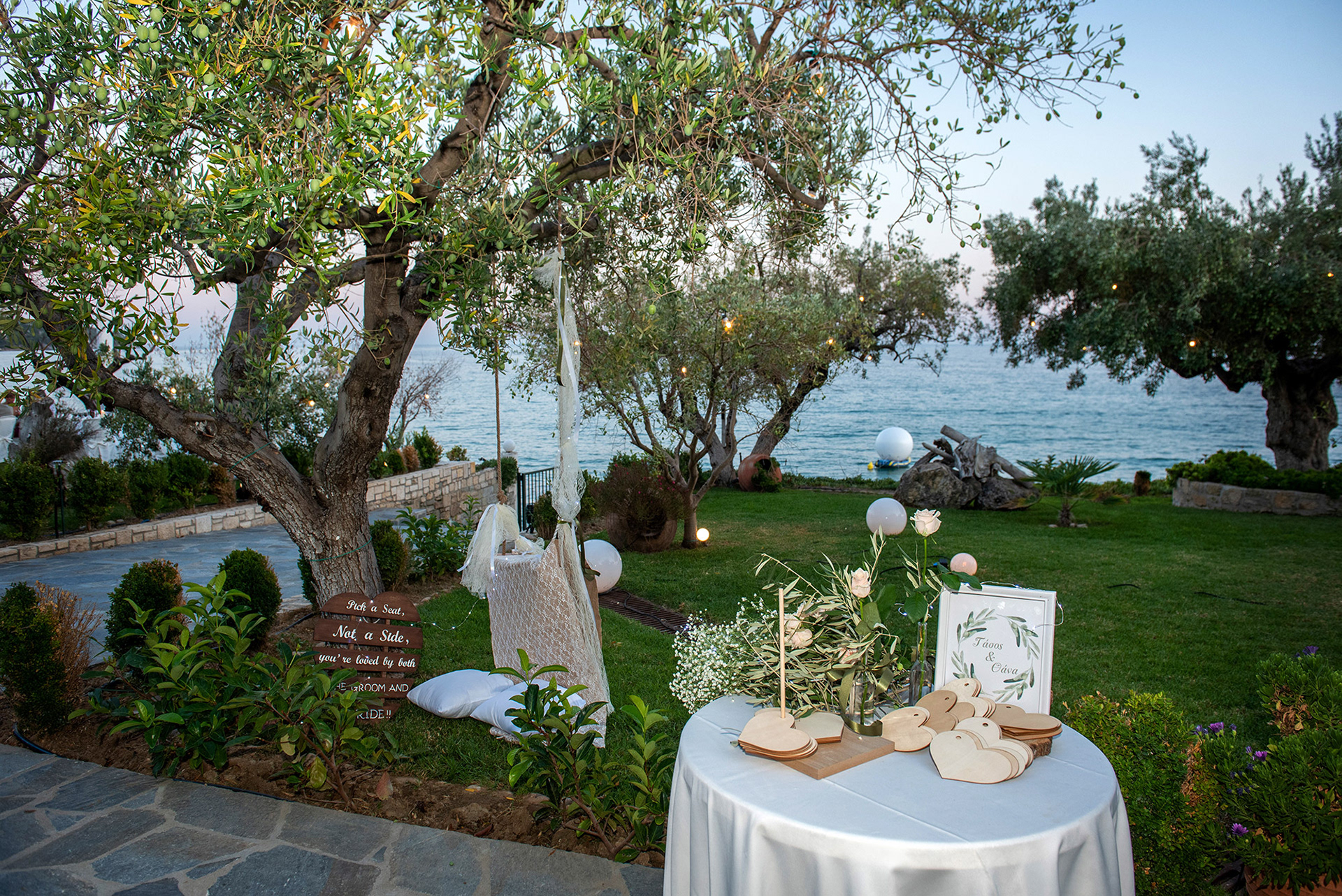 Αμέσως μετά, η γιορτή συνεχίστηκε στο Κτήμα Delmare Πανταζάρα, έναν χώρο μοναδικό στη Χαλκιδική που συνδυάζει την κομψότητα με τη φυσική ομορφιά. Οι καλεσμένοι απόλαυσαν τη θέα προς τη θάλασσα και το μαγευτικό τοπίο με τα ελαιόδεντρα, ενώ οι στιγμές γέμισαν με χορό, συγκίνηση και αληθινή χαρά. Το ζευγάρι υποδέχτηκε τους αγαπημένους του ανθρώπους σε ένα σκηνικό που ταίριαζε απόλυτα στην αισθητική και τον χαρακτήρα τους.